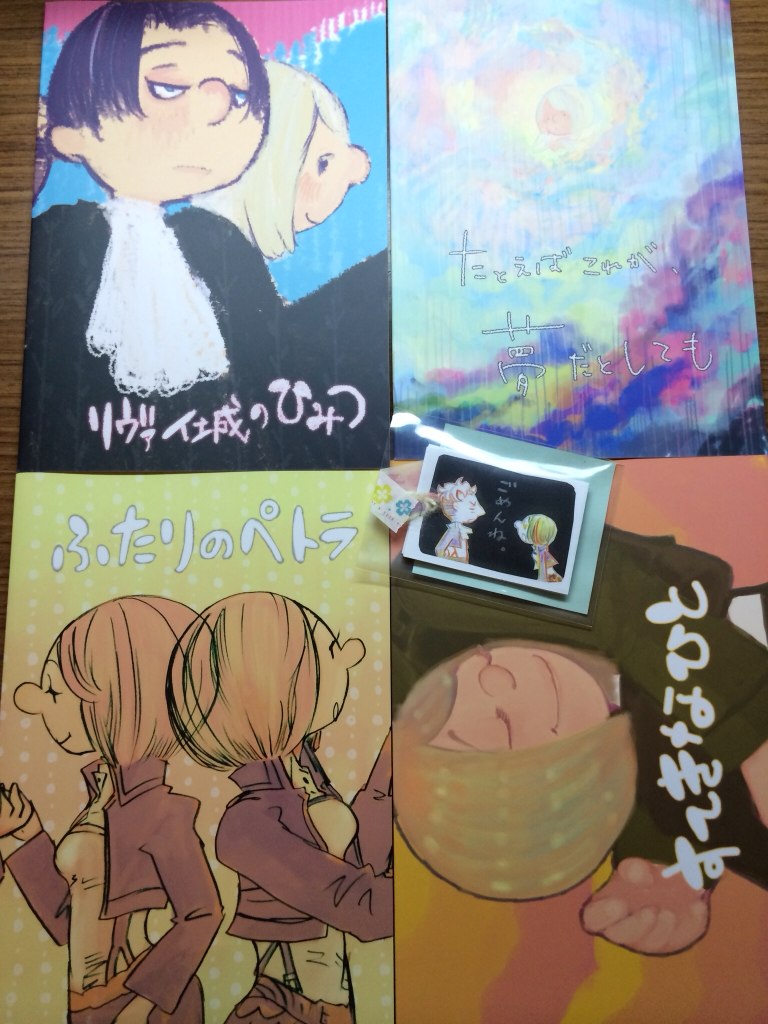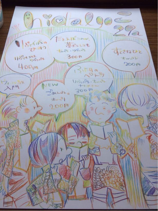 04 February 第2回壁外調査博 スペースは東6ホール ヒ13aです。オルペトでとっています新刊リヴァイ城のリトルバードA5 20ページ冬コミで出す予定だったものですリヴァイ班の本ですがオルペト風味。オルペトというのかなぁ手に取っていただけるとうれしいです! 既刊も全部持っていくと思います。あと、進撃女子プチオンリーの方にも参加しております。プチのほうのサークルカットは提出が出来なかったので(パソコン購入が間に合わなかった)カットは未登録となっておりますがポストカードラリーに方には参加いたします。まだ手元に届いていないのでどんな感じになっているかわかりませんがオルペトな絵なので人を選んでしまうと思いますがどうぞよろしくお願いいたします。 [0回]2014/02/04 11:27:52 オフライン