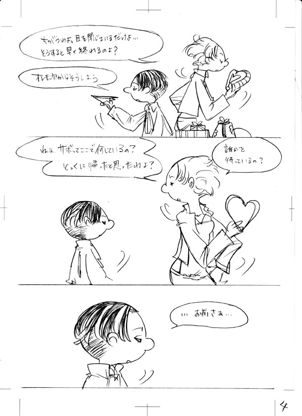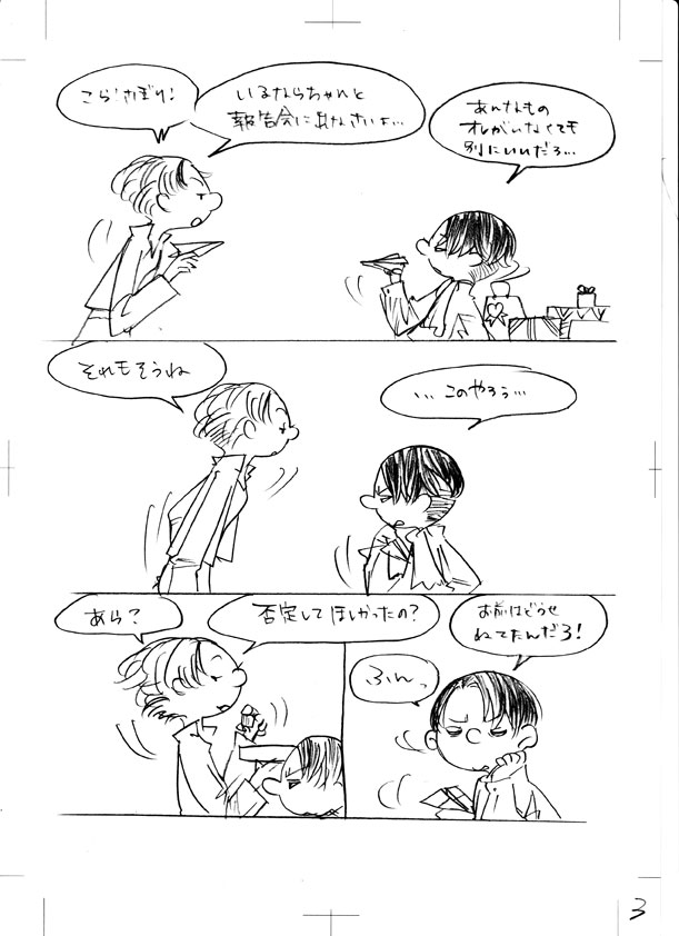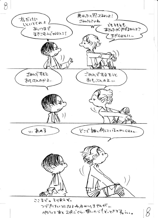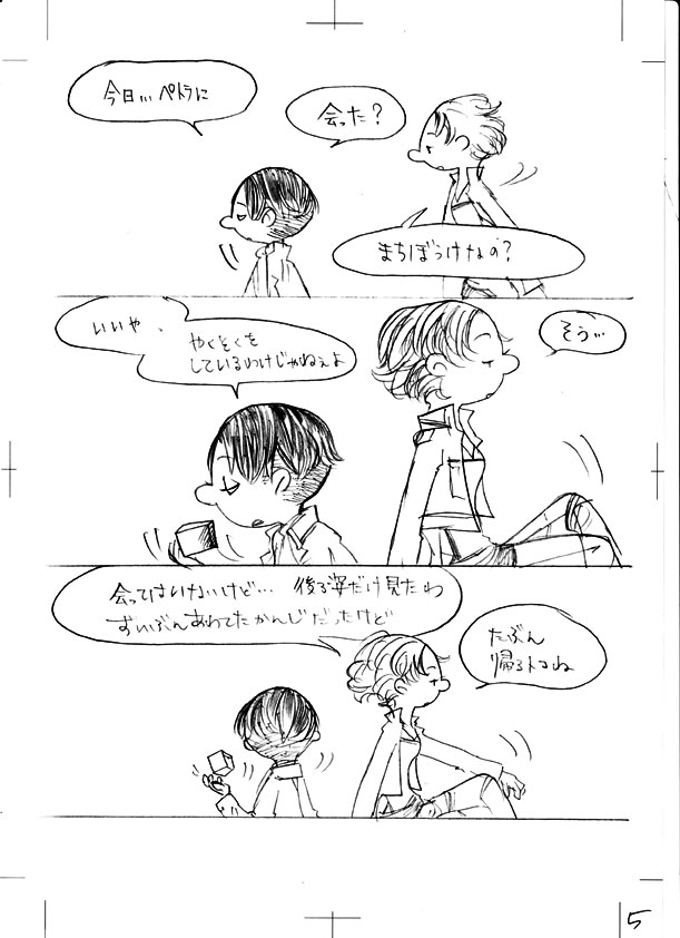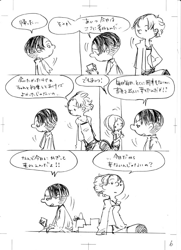 25 February バレンタインの漫画できました たぶん前半って感じで途中 あと、鉛筆描きで台詞も手書きで すごく汚いです… トリミングも何もしないでスキャンしたのそのままなので 色々見えてますが気にしないで下さいw リヴァイとペトラの話なんですけれども 途中までしか描いてないので リヴァイとナナバさんしか出てきてませんw リヴァイとナナバさんは10年来くらいの付き合いがあったらいいなって ずっと思っていて 何でも話せる異性の友達って感じで ハンジさんじゃダメなんですよ 彼女は立場上、本心を押し殺して生きている感じなので 一般兵と会話するとかなさそうだし、してないだろうなって思っているので あくまで私のイメージ [1回]PR2013/02/25 01:11:25 漫画