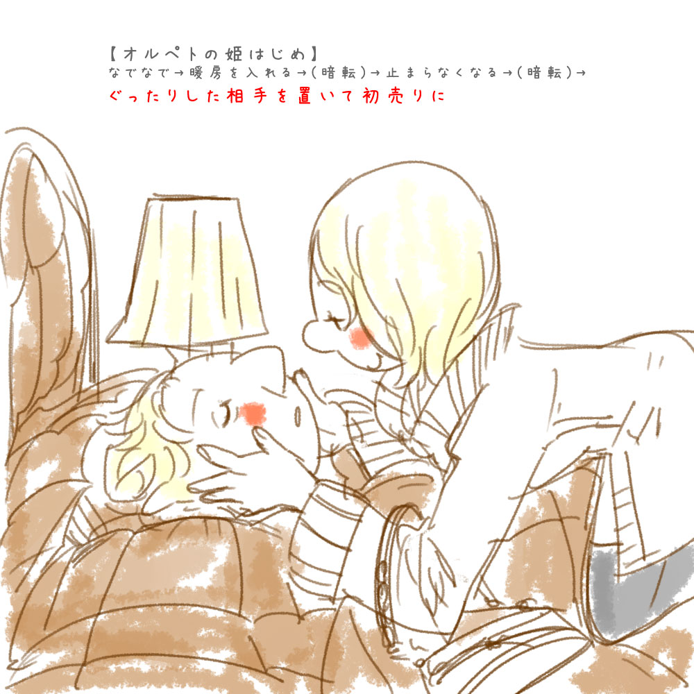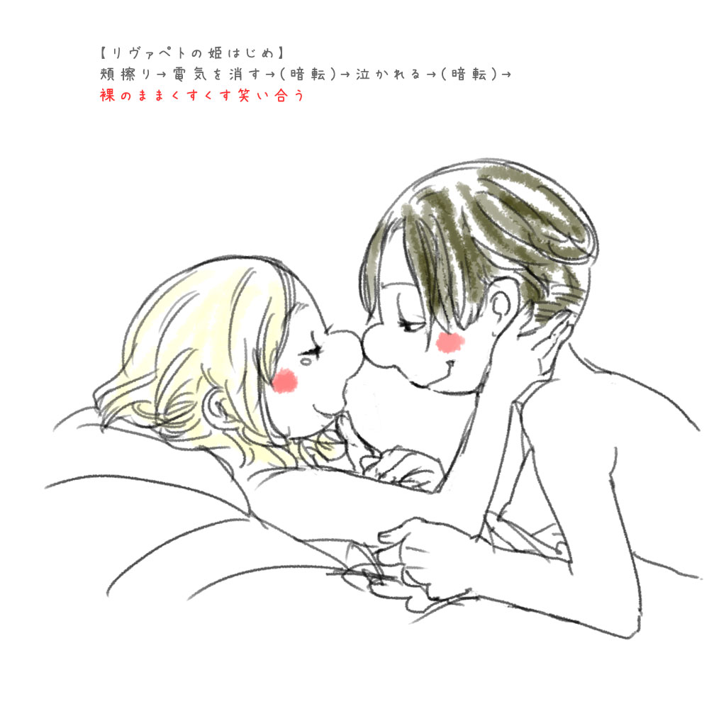 03 January 秘め始めの診断 twitterでTLに流れてきた姫はじめの診断を リヴァペトとオルペトでこっそりやってみたら すごく可愛いかったので…! ただ、忍者ブログってエロだめだから ここまでくらいなら描いても大丈夫なのかな… とちょっとビクビクしていますがたぶん平気 肌色塗ってないから。 今年はもうちょっと色々描きたいなと思っていたから なんかちょうどよかった。 すごく描くのも楽しかったし! オルペト じゃあわたし初売り行って来るからお留守番しててね みたいな リヴァペト ペトラが上でもよかったなぁとちょっと思ってますけど 胸隠さないといけないのが辛い ああ。主線の色変えるの忘れちゃった [3回]PR2013/01/03 02:50:06 落書き