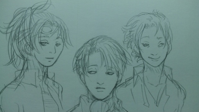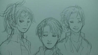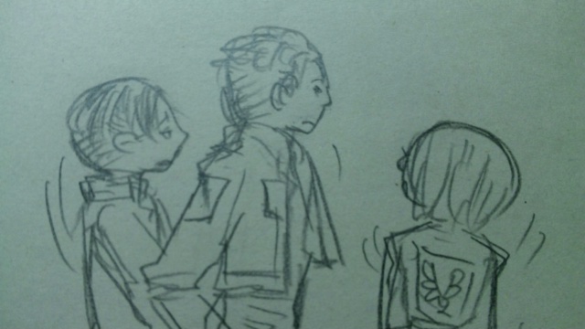 13 August 違う絵柄で 等身高めに身長差イメージして描いてみようとしたんですが最近全然描いてなかったので酷い歪んでいる…あとリヴァイは正面難しい…ハンジさんは8巻見たら意外にも髪の毛短かったんですよねわかっているのに長くなるw [2回]2012/08/13 07:43:30 落書き