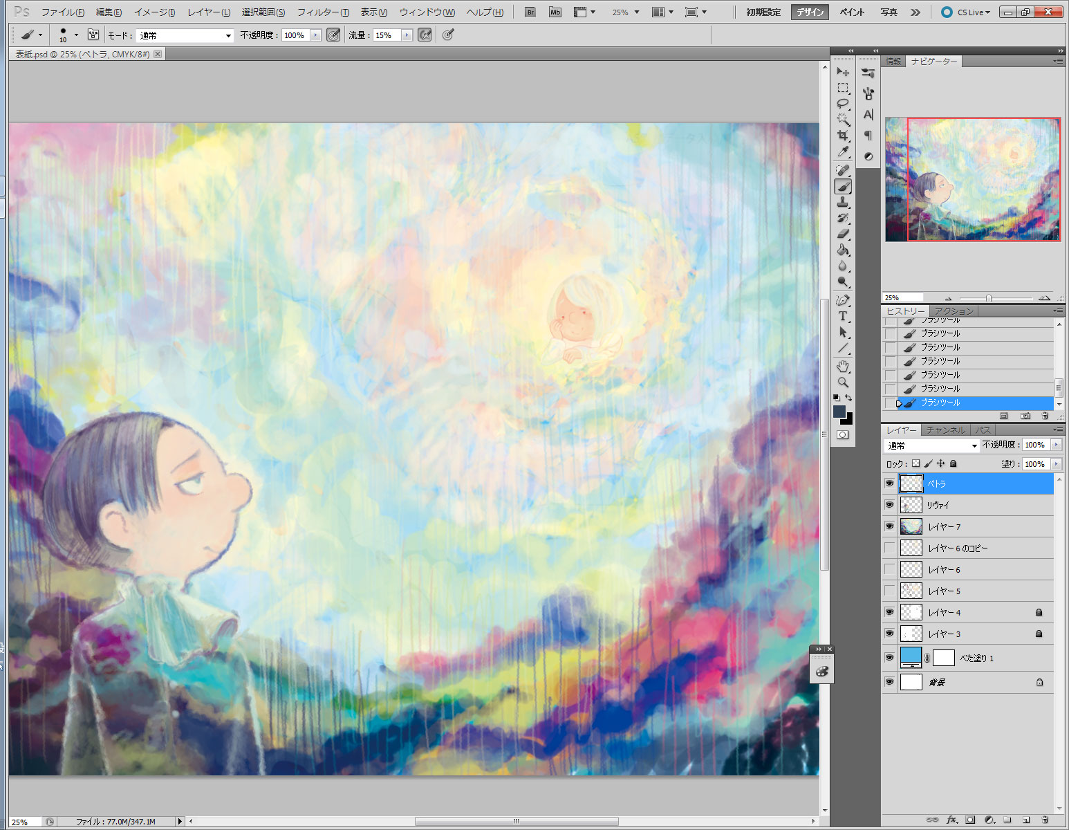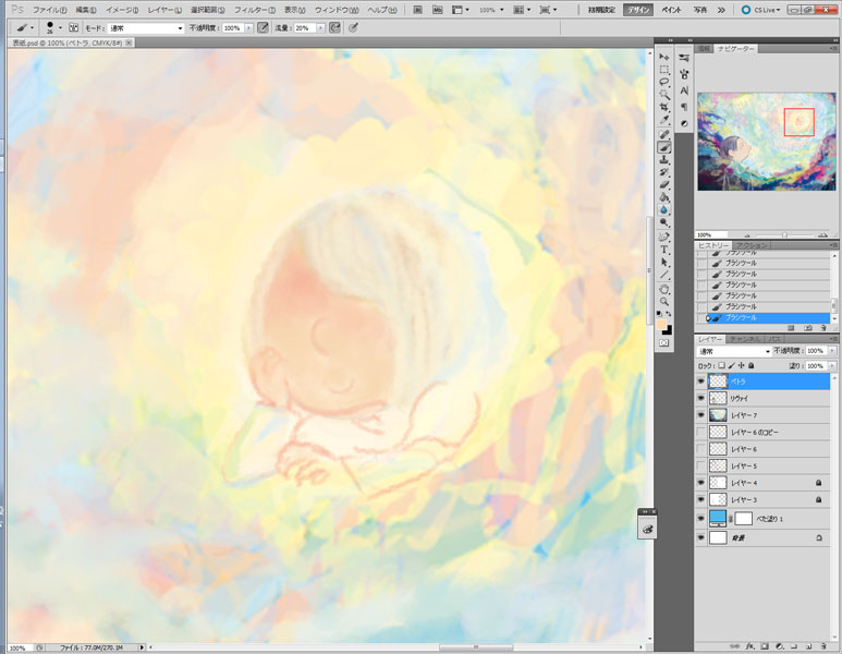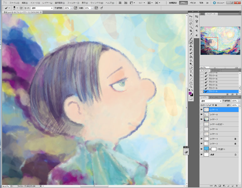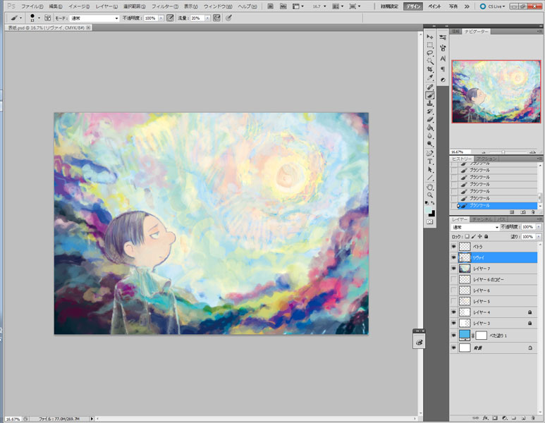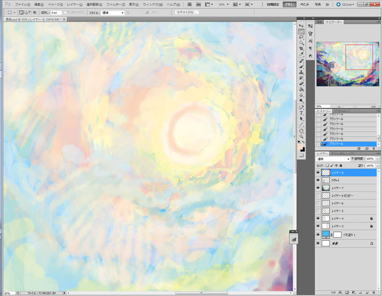 13 June たとえばこれが、夢だとしても 表紙を最後に描いたときに メイキングってわけじゃないけど 過程をキャプチャとか取りながらtwitterにあげていたやつを こっちにも こうやってカラーをちゃんと描くことって滅多にないので 本当。 下書きはB5のコピー用紙に描いたのをスキャンして適当に繋げて CMYKだから色拾うのがなんか難しいのと 400dpiだからちょっと重い… 広いところを塗るのがちょっと大変だったから 複製したものの解像度を72dpiに下げてゴリゴリ塗ってしまう。 やっぱこれがらくちん。前に誰かの配信見て知った。 頭いいよねぇ 大体色を置いたら400dpiのファイルに移して拡大してしまうのです この時画像をすべて統合して移したんだけど うっかり下書きの線画を非表示にし忘れてうっすらみえてしまっていたという… たぶん完成したやつもよく見るとみえてしまうw そろそろ飽きてきたのでリヴァイを掘り起こす作業 線画を引いて塗りつぶすってことがどうしても出来なくて 上塗りしては統合するのを繰り返す感じ 色はそこらへんからスポイトで吸って持ってくる。 リヴァイは黒髪だけれど、濃ければいいと思っているので… リヴァイは大体出来たから今度ペトラ リヴァイの目直してるね。 ペトラは小さい上に色が薄いからすごく大変だった… 大体完成に近い。大分飽きてきてる もういいやーって終了 もうちょっと時間が合ったら次の日に丁寧に描いてもよかったかもしれませんが タイトルは手書きです。フォントを使ってみたけどどうも合わなくて デスクトップに転がっていた本文のやつ 私は全部photshopでやっております 今回主線はB5のコピー用紙に3Bの鉛筆で描いたものを使っていて 黒いところも鉛筆で塗りつぶしているので完成本がどうなっているかちょっと心配…w でも一番合っているのが鉛筆なんですよねぇ… [2回]PR2013/06/13 03:24:50 雑記